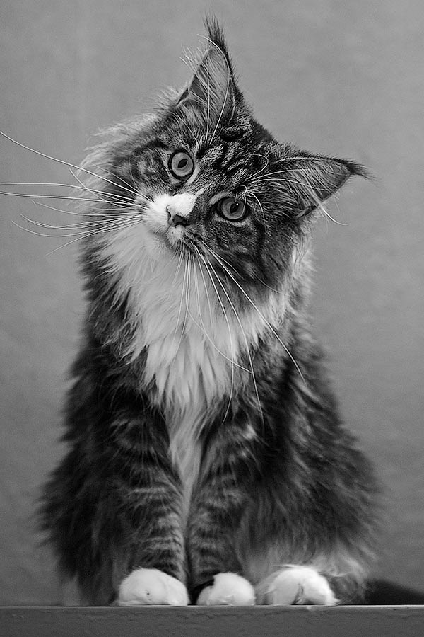 В студии нужны легкие штативы, обычно идут в комплекте, зонты или софт боксы обтянутые белой тканью, и электронные вспышки, оснащенные свето-синхронизаторами. Для съемки достаточно трех источников света, из них два обеспечивают рисующий и заполняющий свет, а третий — контровое освещение. Свет вспышек, отраженный от зонтов, достаточно рассеян и дает хорошее, ровное освещение. Эти условия оптимальны при съемке животных рыжего, серого и тигрового окрасов. Следите за отражениями источников света - в глазах кошек - они могут оказаться очень привлекательными! Заметьте, что фактура шерсти черных кошек при рассеянном освещении теряется, поэтому необходимо вводить дополнительную фотовспышку малой мощности с «прямым» светом. Тогда шерсть животного начинает блестеть, появляется бликовый рисунок, но может появиться тень. Искусство фотографа в том, чтобы суметь точно сбалансировать мощность источников света, их расположение и расстояние до объекта съемки.